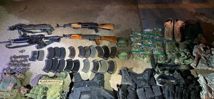 Elementos del Ejército mexicano, Guardia Nacional, Policía Estatal y Municipal, detuvieron a una persona a bordo de un vehículo, le aseguraron cuatro armas largas, dos armas cortas, cargadores, 90 cartuchos y 15 kilos de marihuana, la afectación económica es de 55,132 pesos.