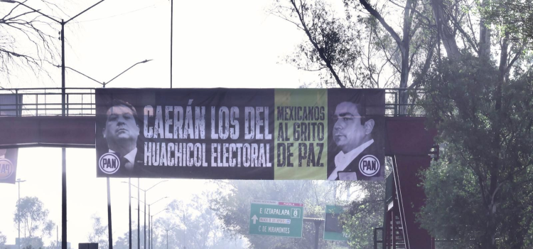 Lo acusan de corrupción y por evadir la justicia mexicana desde el extranjero, pero no mencionan el tema del huachicol fiscal. Las mantas sólo dicen “Caerán los del huachicol electoral”.